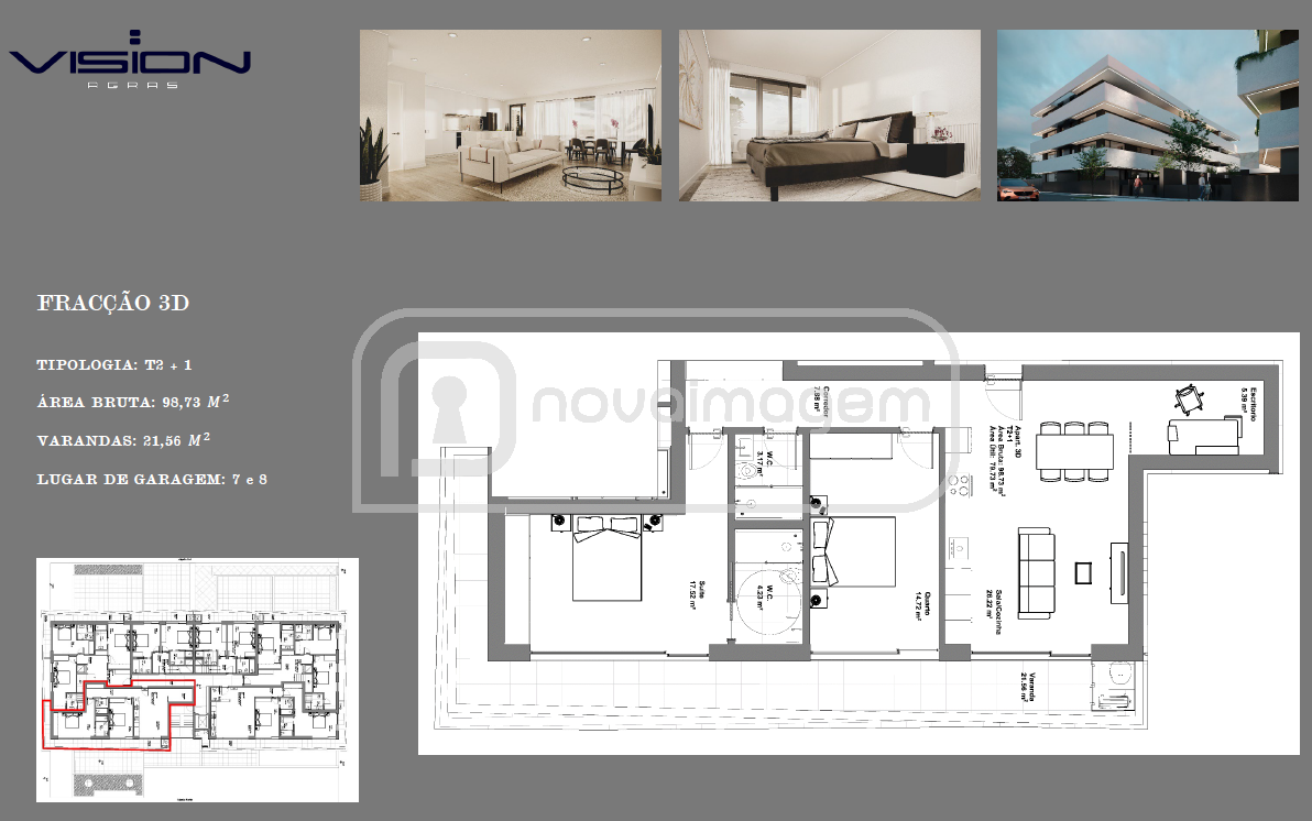 O Edifício “Vision Agras” destaca-se pela sua arquitetura contemporânea, conjugada com design moderno e elegante, contemplando apartamentos de tipologias T1, T2, T2 Duplex, T3 e T3 Duplex.