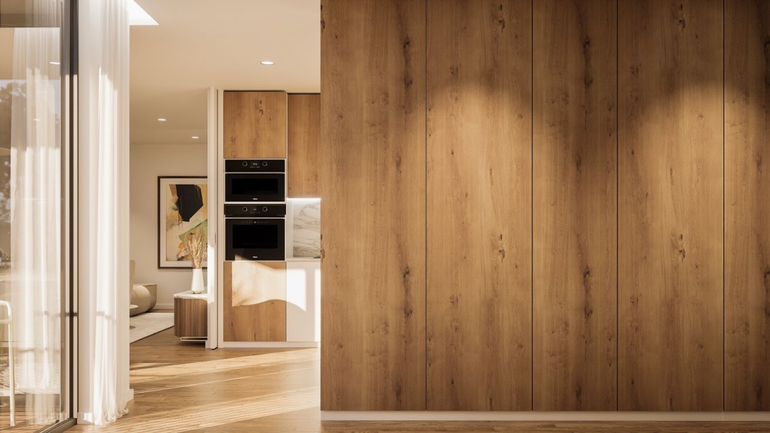 Cozinha e sala em conceito de Openspace. Cozinha equipada com placa de indução, forno elétrico, micro ondas, máquina de lavar louça, exaustor e combinado.