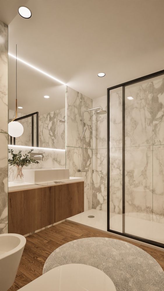 Casas de banho modernas com louças suspensas e acabamentos de design.